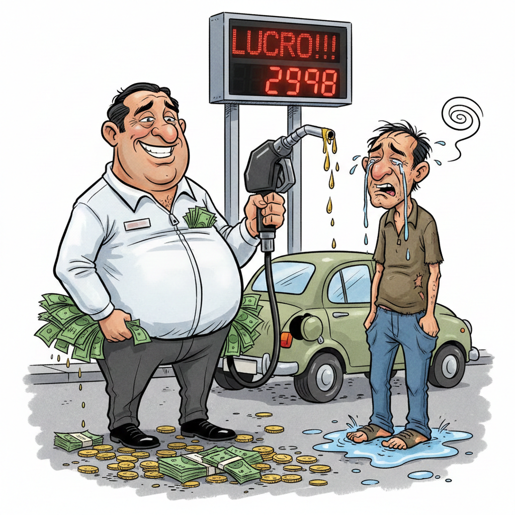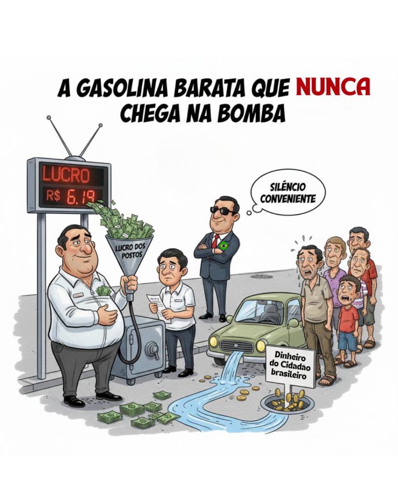 O governo federal reduziu o preço. Os postos aumentaram o lucro. A TV ficou em silêncio. Os governadores olharam para o lado. E o trabalhador continua pagando a conta.